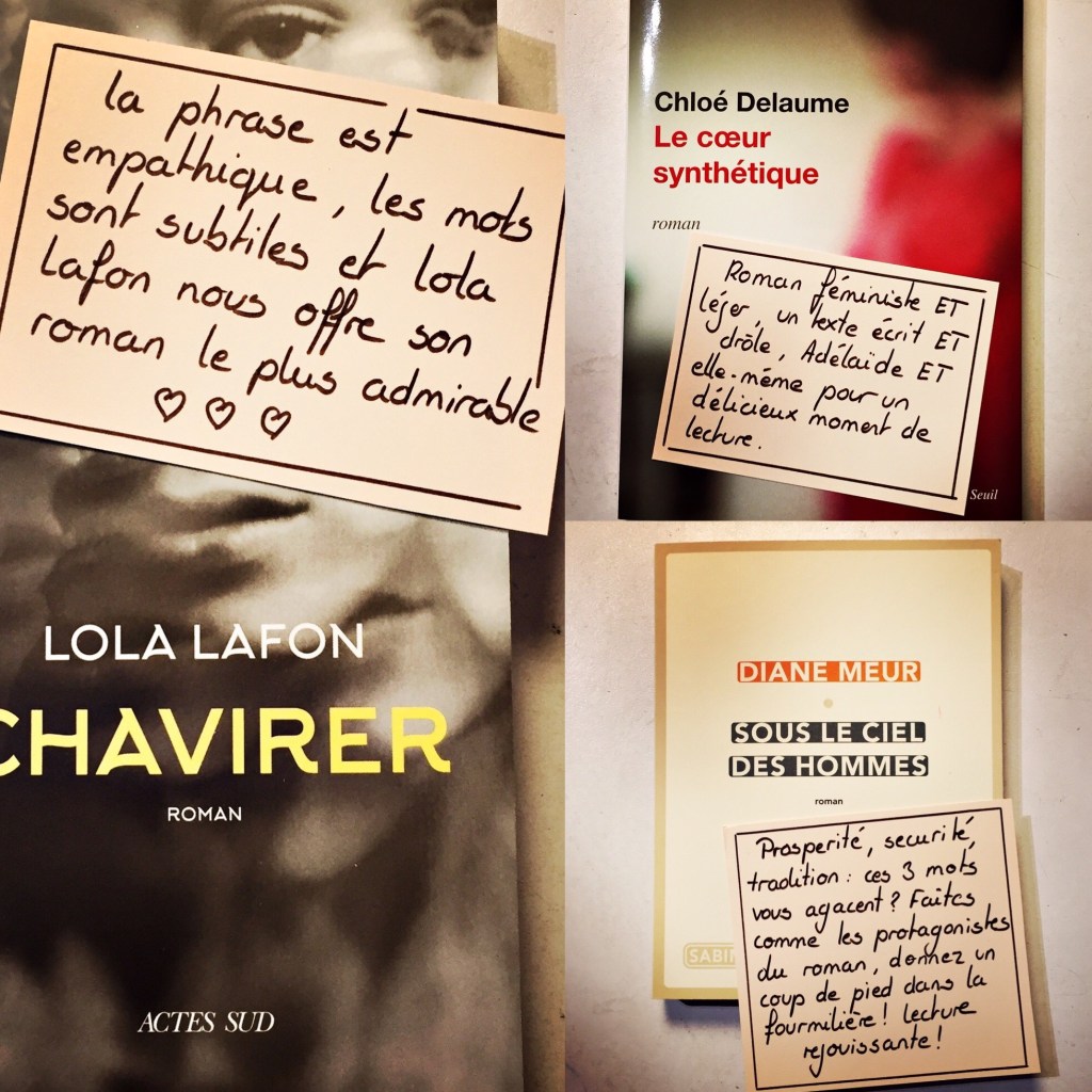 Trois autrices puissantes dans notre vitrine: Diane Meur, Chloé Delaume et Lola Lafon. Des autrices que nous admirons et qui brillent cet automne avec Sous le ciel des hommes, Le cœur synthétique et Chavirer. N’hésitez pas à nous les demander.