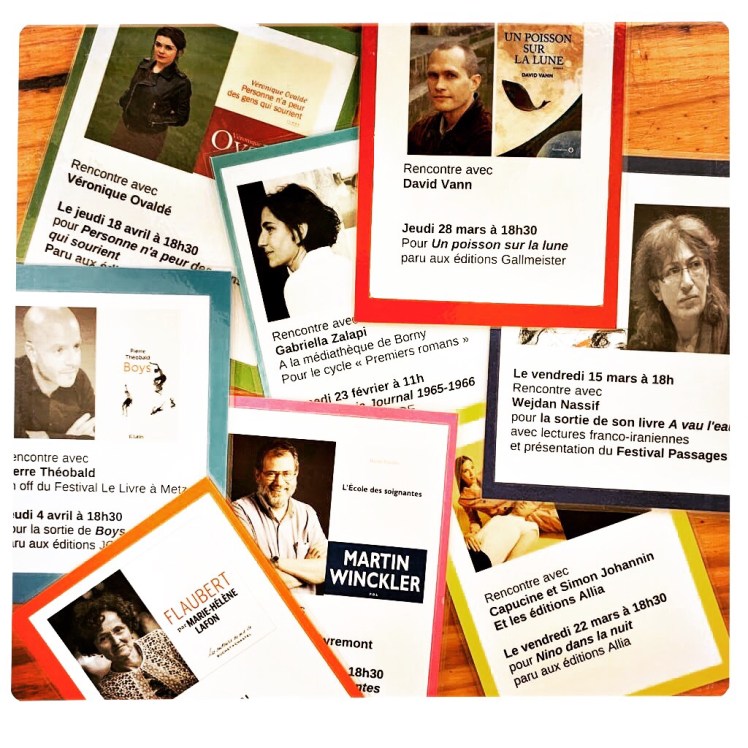 Les rencontres s’affichent hautes en couleur sur la vitrine de la librairie et sur le comptoir le programme papier de mars et avril. Venez vous servir!